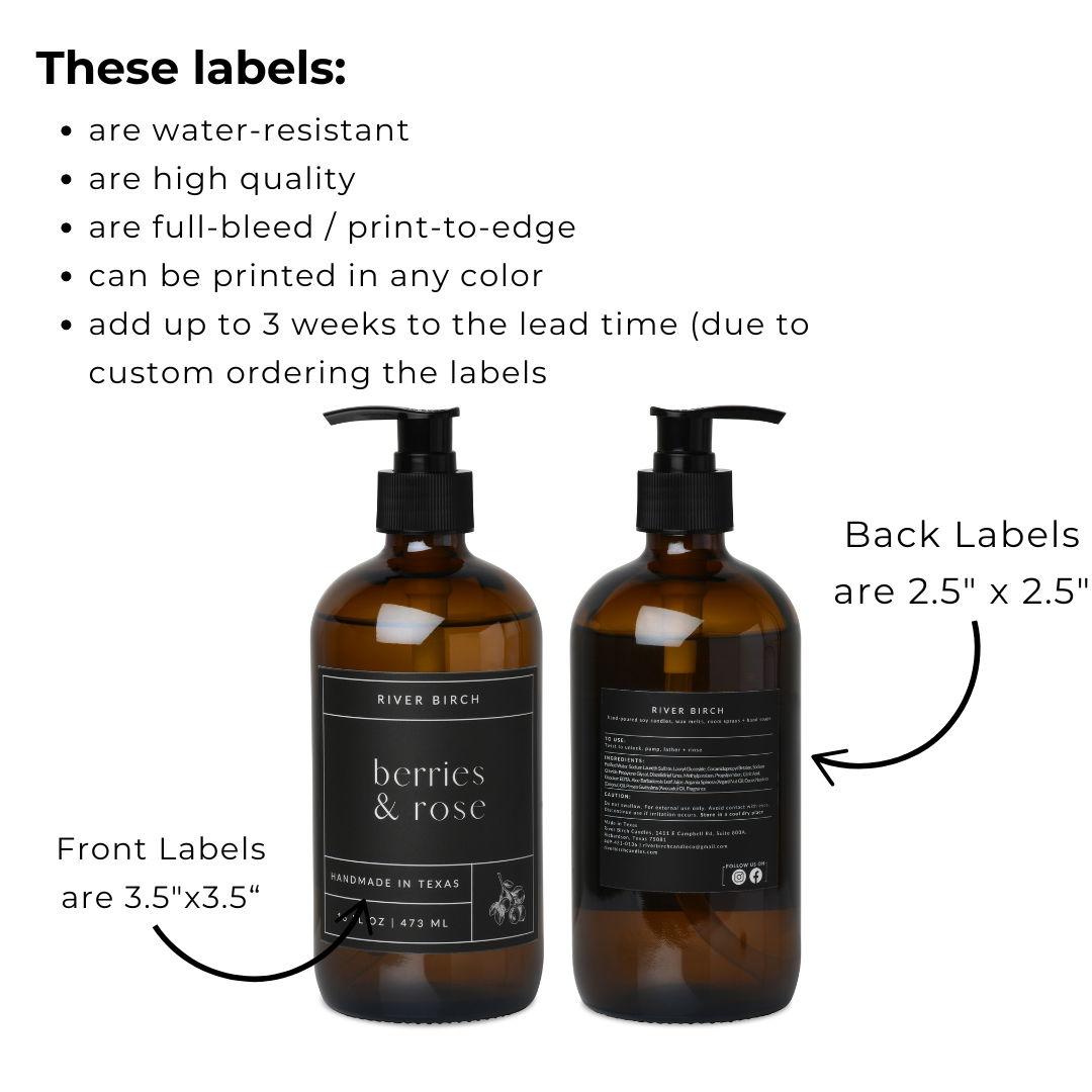 - Custom labels for Amber Soaps add up to 3 weeks to the lead time (due to custom ordering the labels)