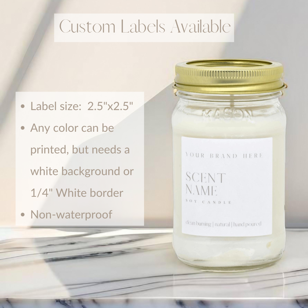 We can print it for you and apply custom labels to make it quick and simple. We use a label that is 2.5"x2.5" that goes on the side of the candle.