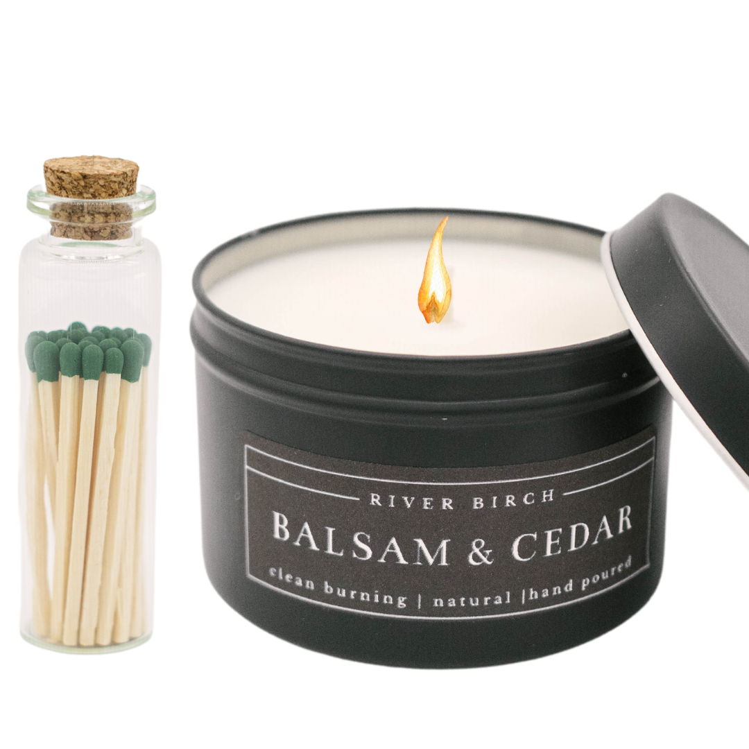 8oz Balsam & Cedar Black Tin + Forest Green Matches
