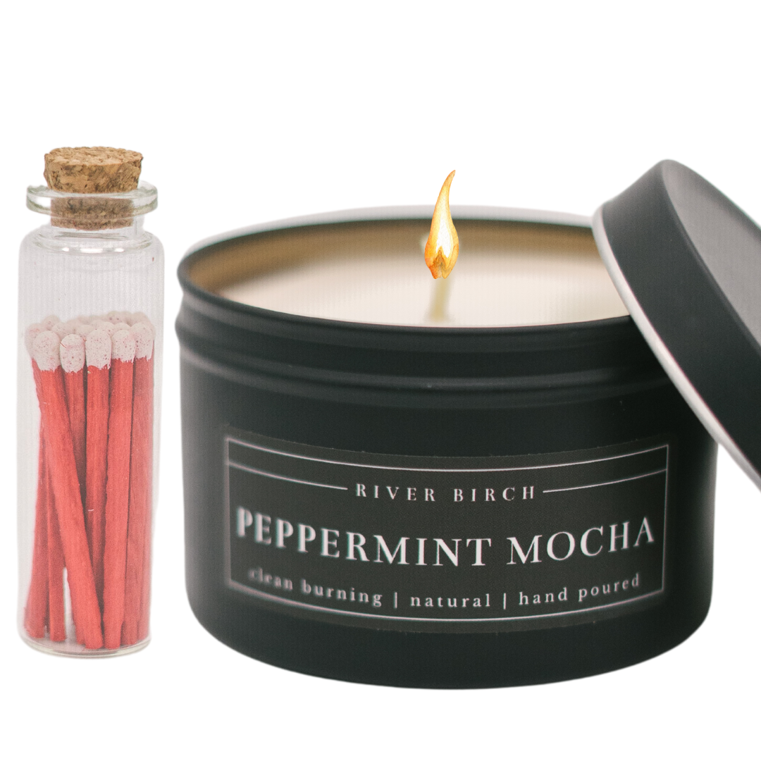 8oz Peppermint Mocha Black Tin + Peppermint Matches