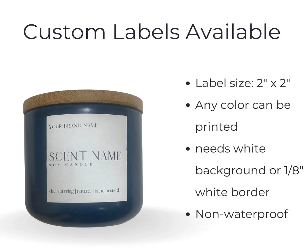 We can print it for you and apply custom labels to make it quick and simple. We use a label that is 2"x2" with a white border or white background for our 8 oz Ceramic Candles