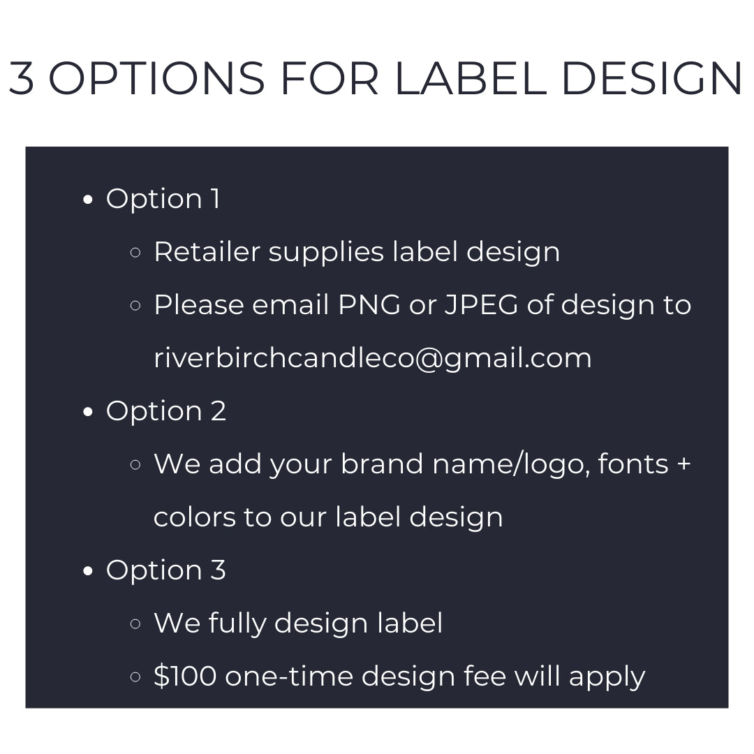 Option 1 - We print a label design you provide. Label size varies with the vessel Option 2 - We add your brand name/fonts and colors to our label design Option 3 - We fully design labels ($100 one-time design fee will apply) Please reply to order confirmation with which option you would like if you select "Custom Labels"