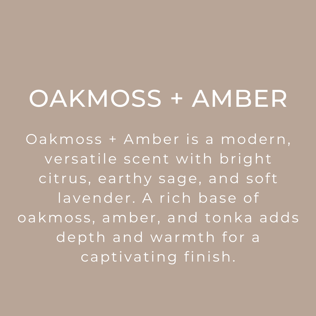 Oakmoss and Amber is a modern fragrance with universal appeal. This captivating scent begins with hints of orange, grapefruit, and an infusion of sage that enhance the natural earthy quality. Lavender adds a soft floral and herbal touch to the heart of this scent, while oakmoss, amber, and tonka round out the base for a beautiful, deep character