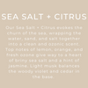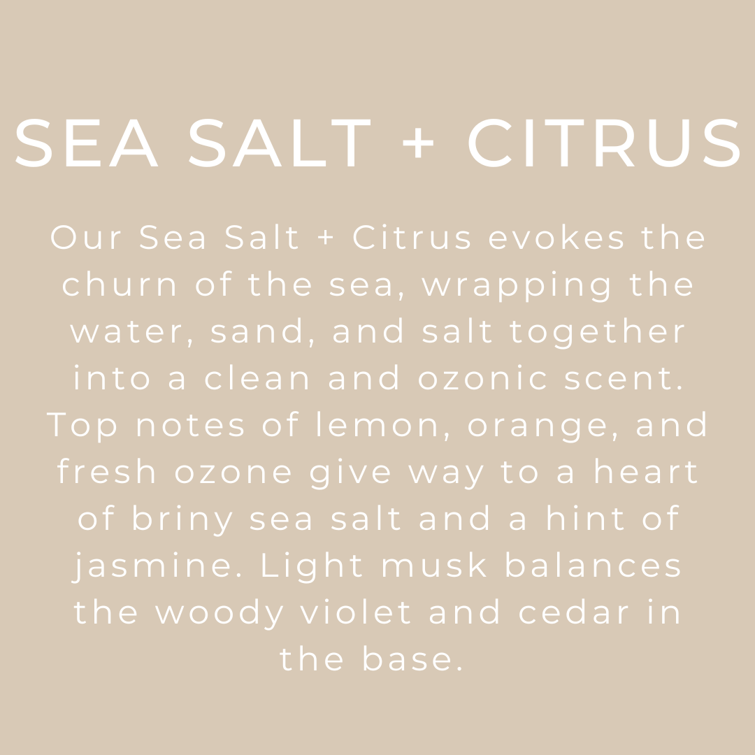 Our Sea Salt + Citrus evokes the churn of the sea, wrapping the water, sand, and salt together into a clean and ozonic scent. Top notes of lemon, orange, and fresh ozone give way to a heart of briny sea salt and a hint of jasmine. Light musk balances the woody violet and cedar in the base.