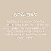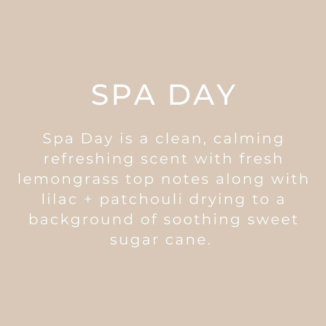 Spa Day is a clean, calming refreshing scent with fresh lemongrass top notes along with lilac + patchouli drying to a background of soothing sweet sugar cane.
