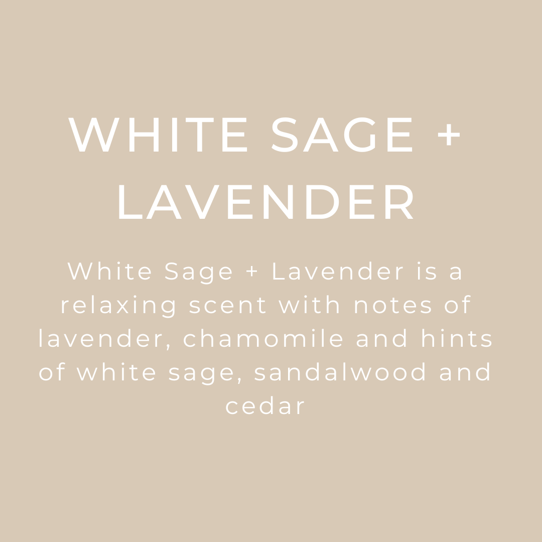 White Sage + Lavender is a relaxing scent with notes of lavender, chamomile and hints of white sage, sandalwood and cedar