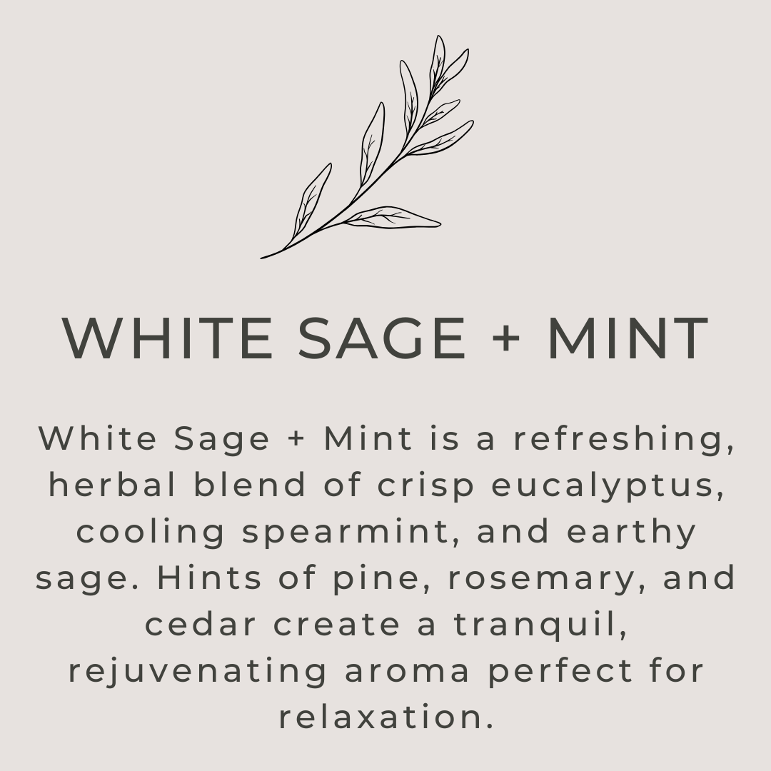 White Sage + Mint is a refreshing, herbal blend of crisp eucalyptus, cooling spearmint, and earthy sage. Hints of pine, rosemary, and cedar create a tranquil, rejuvenating aroma perfect for relaxation.
