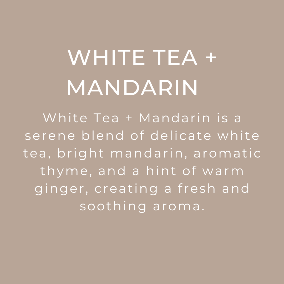 White Tea + Mandarin is a serene blend of delicate white tea, bright mandarin, aromatic thyme, and a hint of warm ginger, creating a fresh and soothing aroma.